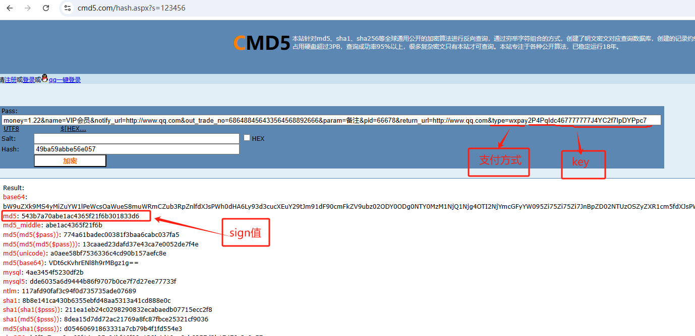 3、再将拼接好的字符串与商户密钥KEY进行MD5加密得出sign签名参数,sign = md5 ( a=b&c=d&e=f + KEY ) (注意:+ 为各语言的拼接符,不是字符!),md5结果为小写。